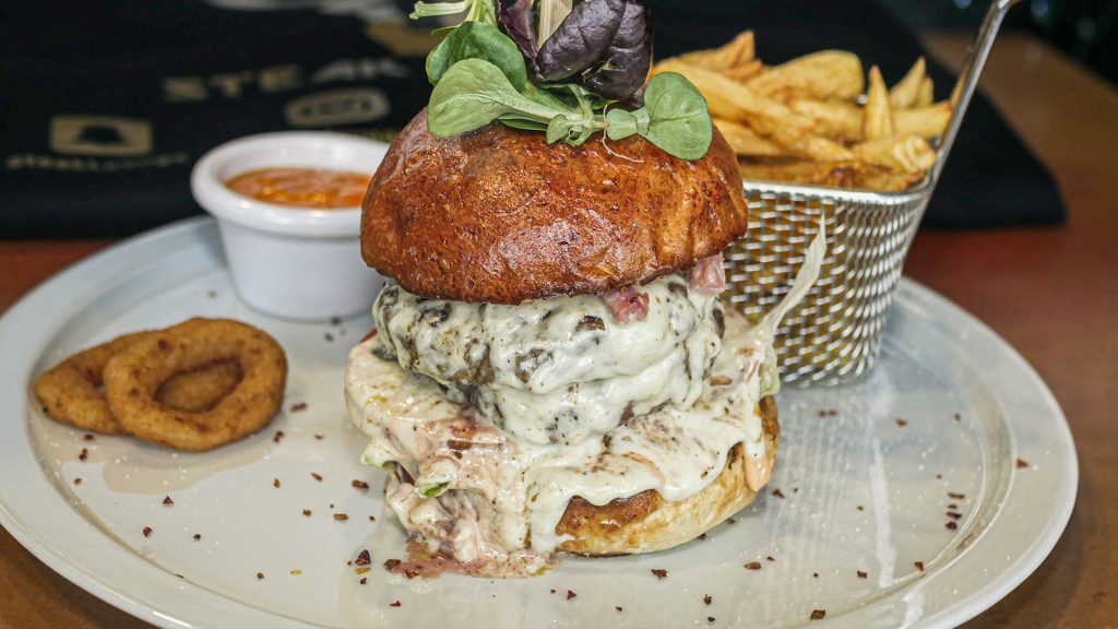 18.90€Deux steaks frais, lardons de dinde fumés, émiettés de roquefort, fondue d’oignons, salade, tomates, sauce roquefort.