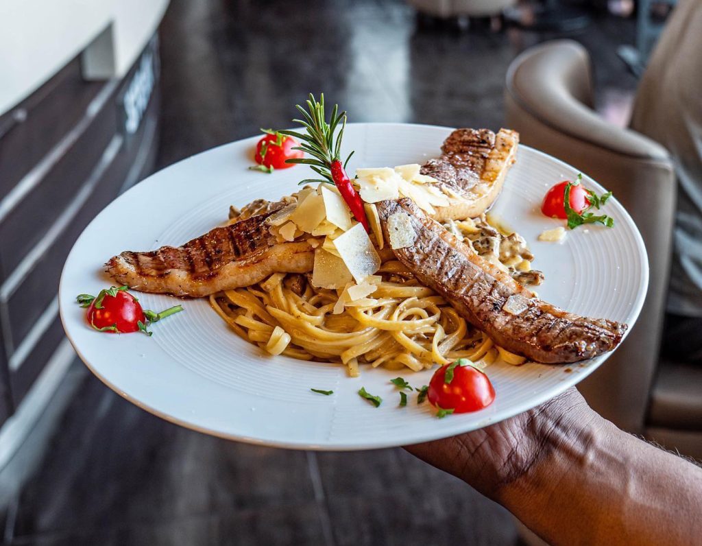 26.90€Linguines, émincés de filet de boeuf, sauce aux cèpes, parmesan.